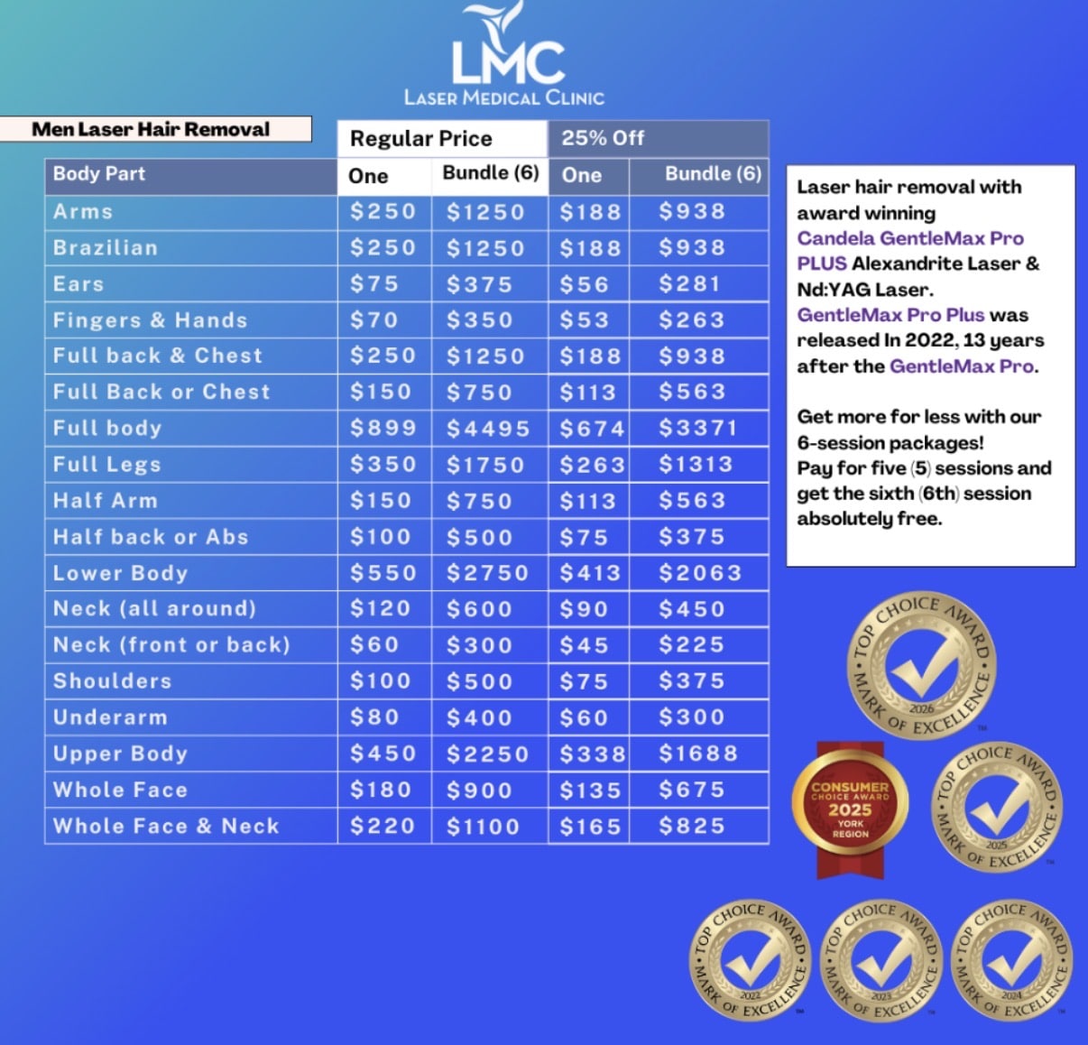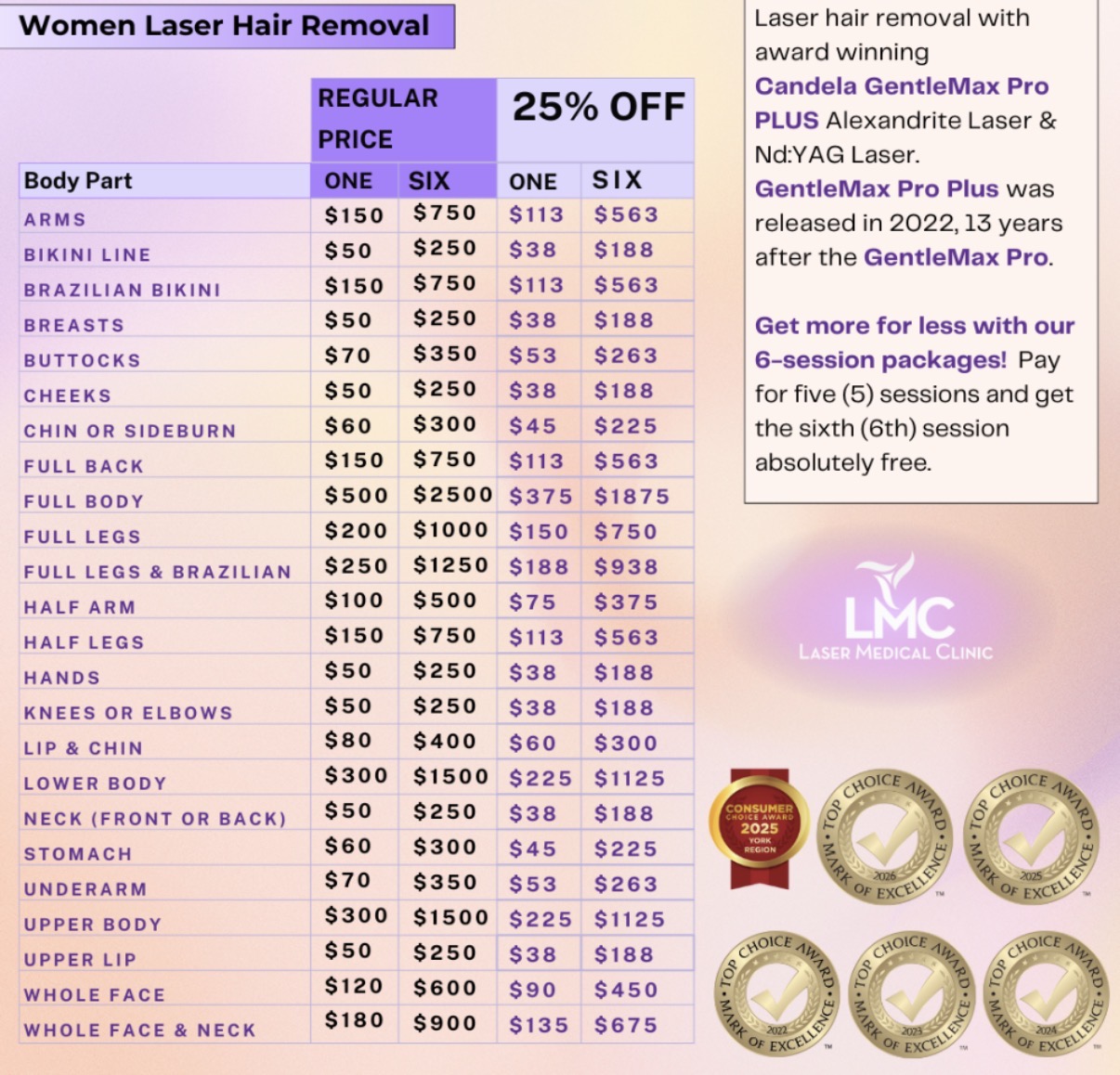 During your GentleMax Pro Plus laser hair removal journey at LMC, your laser technician will keep you updated on how many more sessions you will need and your ongoing progress.
